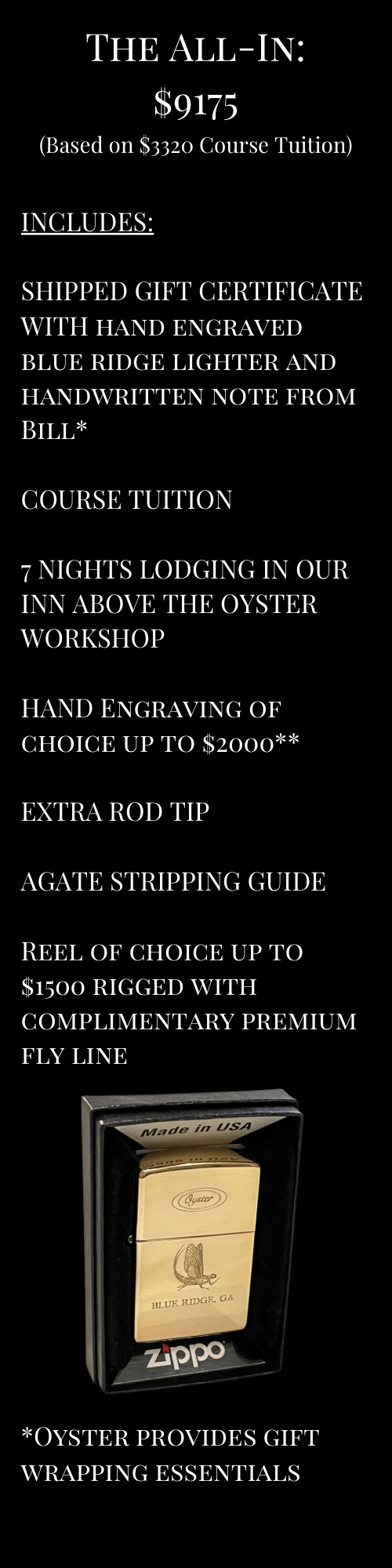 Below are package suggestions for those wanting an all-inclusive gift experience, frequently purchased for a variety of occasions, including (but not limited to) corporate or executive gifts, retirement gift, graduations, birthdays and other milestones.