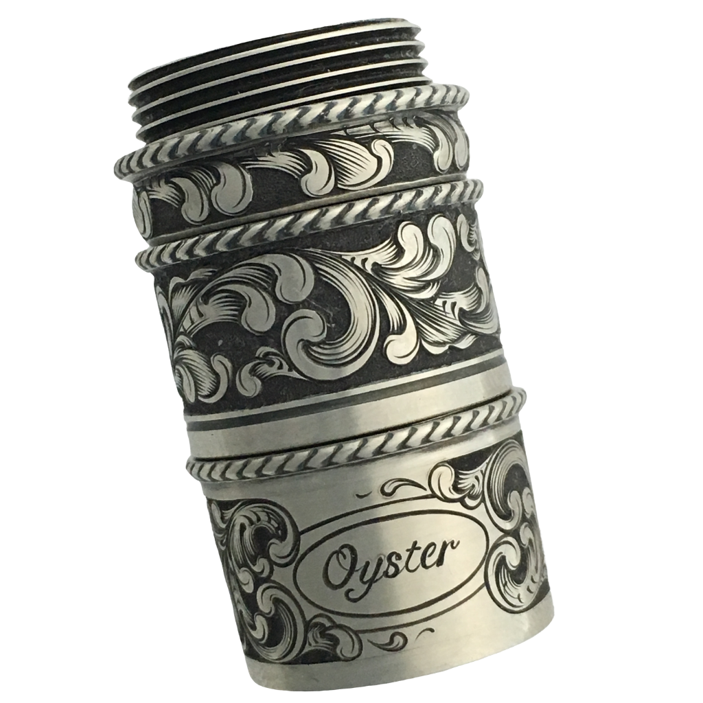 - Full coverage hand engraving by Oyster on reel seat and ferrules